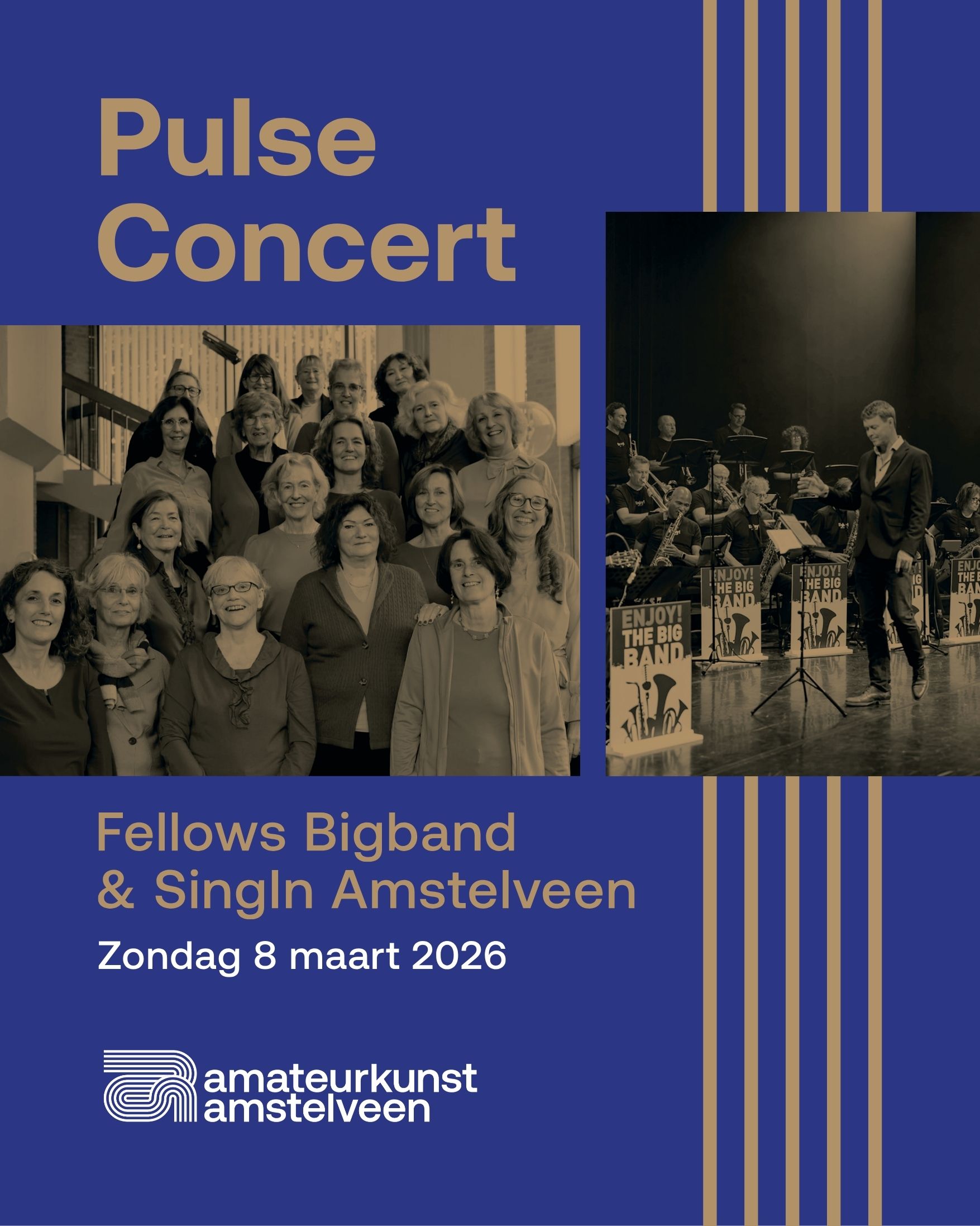 Op zondag 8 maart 2026 verzorgen Fellows Bigband en SingIn Amstelveen samen het Pulse Concert. Kom kijken naar deze muzikale middag en geniet van de veelzijdigheid van deze twee verenigingen. Op initiatief van Amateurkunst Amstelveen zijn zij samengebracht voor dit bijzondere concert.